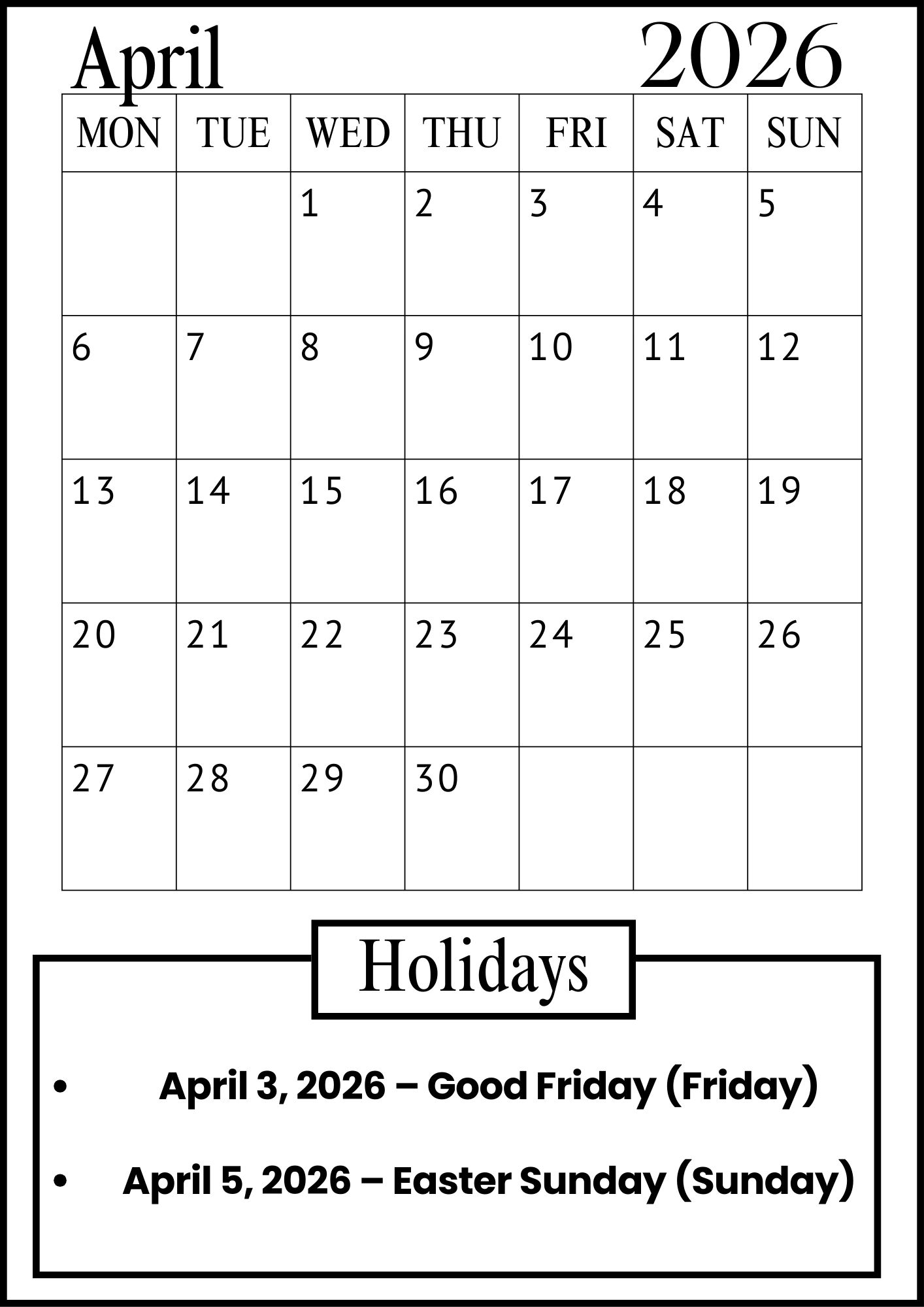 Most calendars come in A4 or Letter size, so printing them at home or at work isn’t an issue. Some designs are very simple, others give you more room to write. People who like to plan things out—students, parents, teachers, busy professionals—usually prefer calendars with notes because everything stays in one place. The April Notes Calendar 2026 helps you see what’s coming without feeling cluttered.